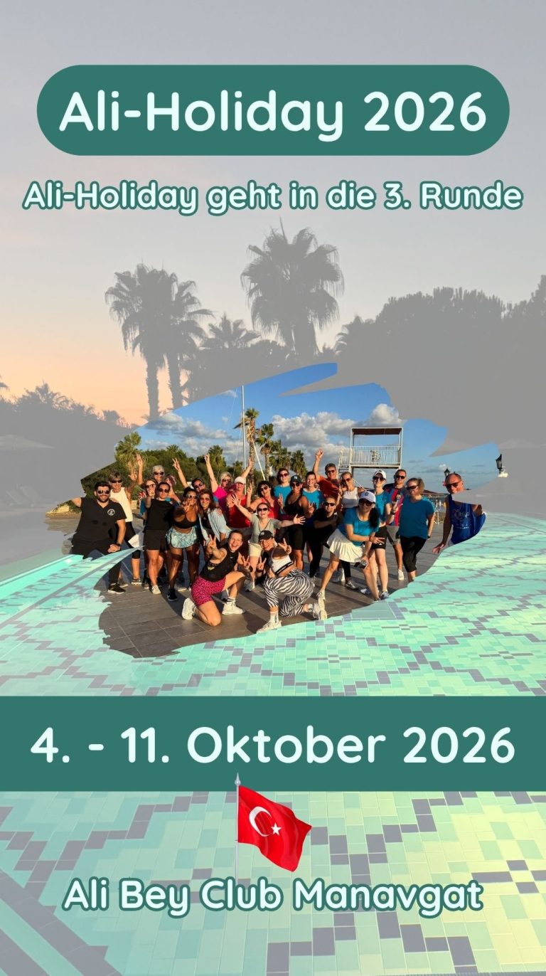 Eine Woche Zumba® und mehr unter der türkischen Sonne, bei angenehmen Temperaturen und leckerem Essen. Bereits zum 3. Mal reisen wir gemeinsam ins Ali Bey nach Manavgat um eine unvergessliche Woche voller Sport, Sonne, Strand und Glücksmomenten zu erleben.